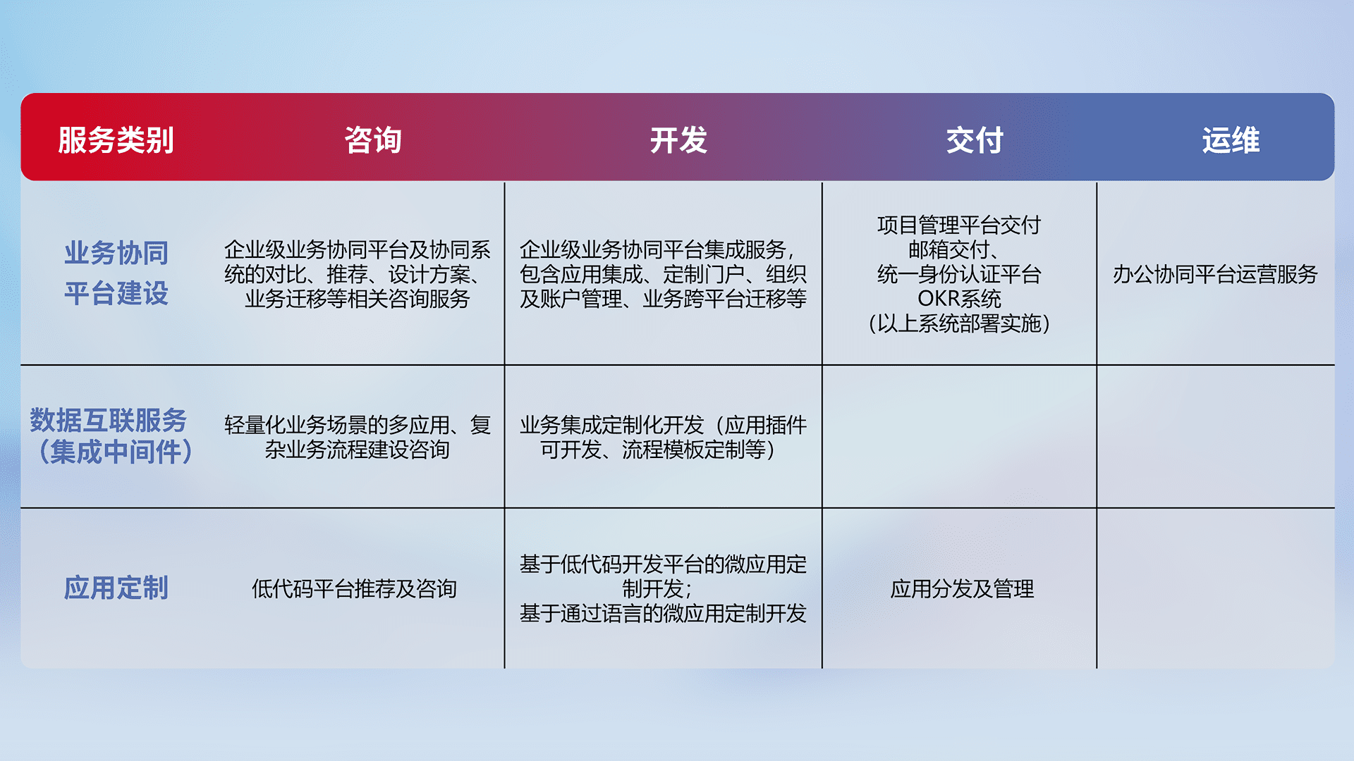 针对钉钉、、企微、、IDaas等平台级产品提供产品的规划、、、、方案、、、、交付、、、定制化开发等服务,,,实现如统一协同办公、、、、智能客户服务、、、混合会议管理、、、智能数据查询、、等业务场景,,,,实现数字化转型。。。。