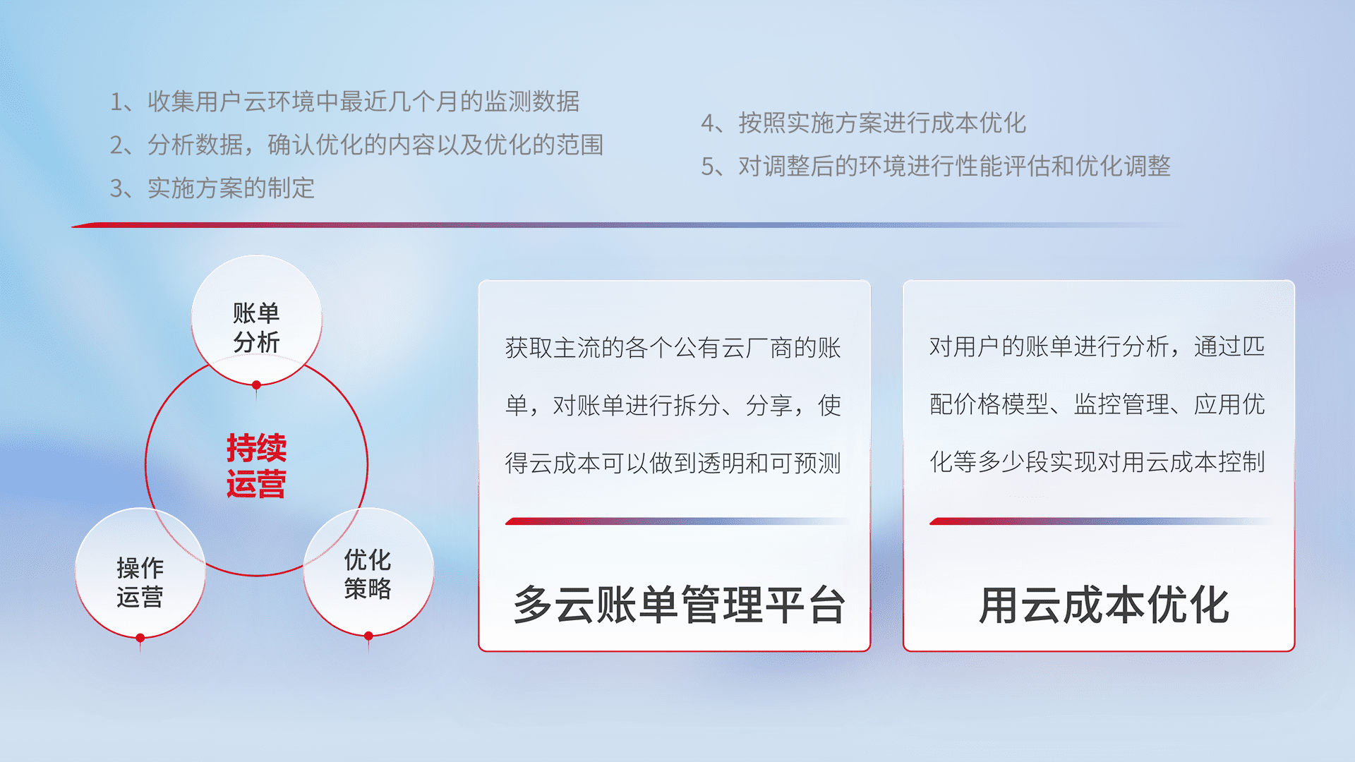 通过多云纳管,,,以统一的资源数据模型把客户的云资源进行抽象和封装,,,,进而实现对多云资源的统一操作,,保障云资源管理的可靠性、、、稳定性与可用性。。。。量身定制化运维内容,,配置、、开发运维、、补丁管理、、、备份、、监控、、认证和访问管理、、、审计和日常巡检等,,,保障在用云过程中的可靠度,,稳定度以及高可用率。。。